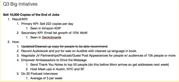 这样,每 90 天的冲刺阶段就有一个明确的方向,你遇到的每个机会都可以用“这是否让我更接近卖出一万本书”来衡量。