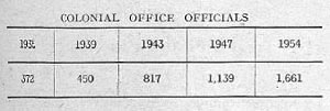 追踪 1935 年海军部 8118 名工作人员到 1954 年增至 33788 人的进一步过程会很有趣。但在帝国衰落时期,殖民地办公室的工作人员提供了更好的研究领域。相关统计数据列于下表。在显示增长率之前,我们必须注意到,这个部门的职责范围在这 20 年间远非恒定。 1935 年至 1939 年间,殖民地的面积或人口变化不大。到 1943 年,由于某些地区落入敌手,殖民地面积大大缩小。 1947 年又有所增加,但此后随着连续的殖民地获得自治,殖民地面积逐年稳步缩小。