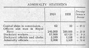 下图源自 1914 年和 1928 年的海军统计数据。当时的批评集中在可用于作战的人员数量急剧下降与仅可用于行政管理的人员数量急剧上升之间的对比,据说这创造了“一支陆地上的宏伟海军”。但那种对比与当前目的无关。我们需要注意的是,1914 年的 2000 名海军部官员到 1928 年已经变成了 3569 人;而这种增长与他们工作量的任何可能增加都无关。事实上,在那段时期,海军的人员减少了三分之一,舰船减少了三分之二。而且,从 1922 年起,海军的实力甚至不再预期会增加,因为其舰船总数(不同于官员总数)受到了那年《华盛顿海军条约》的限制。然而在这种情况下,14 年间海军部官员增加了 78.45%,平均每年比早期总数增加 5.6%。实际上,正如我们将看到的,增长率并不像那样规律。在这个阶段,我们只需考虑给定时期内的百分比增长。