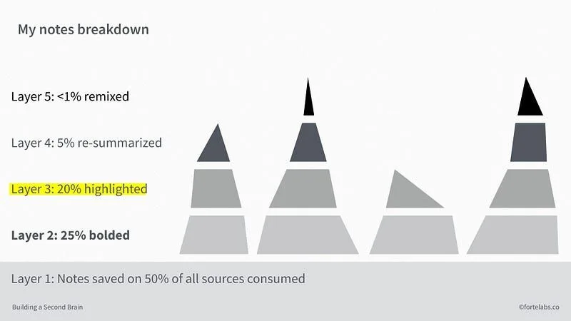 - 但制作摘要需要更多努力,所以在高亮处理的笔记中,只有四分之一会被提炼到第四层——执行摘要,这占了原始信息的百分之五。