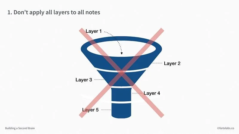 我们的目标,绝不是要让每一条笔记都经过所有的总结层级。这不是一个漏斗,更多的笔记并不意味着更好: