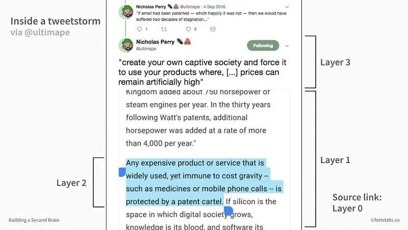 最初的第零层是原始信息源,在主题的最后附有链接。第一层,尼古拉斯截图并将其附在推文中。第二层是他特别强调的部分。第三层则是推文正文,他在这里转述了某个观点,以加强其影响力。